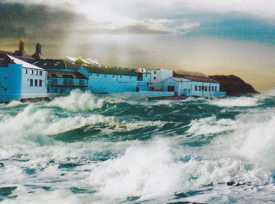荒海にさらされるロッホ・インダールと入り江の防波堤に建つボウモア蒸留所。