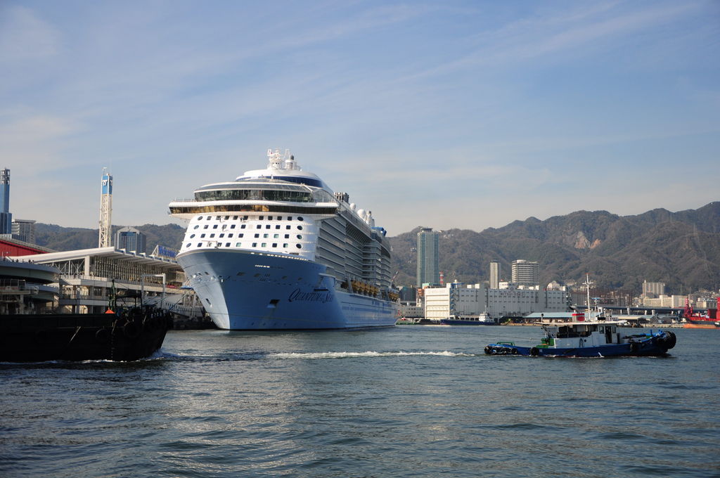 神戸港では桜の咲くベストシーズンを迎える、今月17日に乗客乗員合わせて5,600名の巨大豪華客船「クァンタム・オブ・ザ・シーズ」168,000総トンが寄港し、大阪港には22日早朝、乗客定員2,092名、乗員1,000名「クイーン・エリザベス」90,900総トンが寄港した。