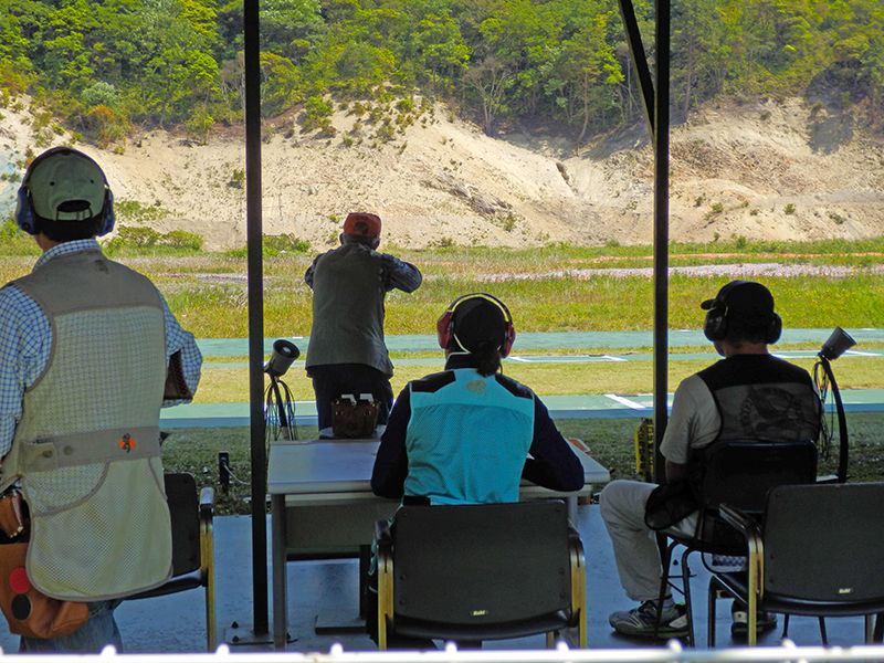 早朝から射撃場の駐車場は関西以外のナンバーの車で遠方より来場した射手たちも参加して、トラップ種目はA射面、B射面の両面から同時に8時にスタートした。