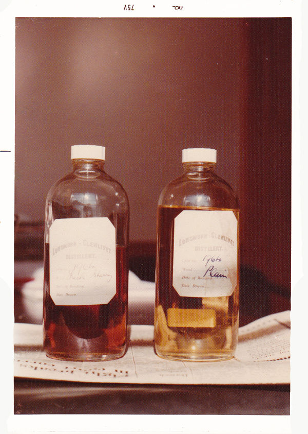 ダークカラーのサンプルはシェリー樽1964年蒸留の12年熟成物と、もう1本はヨーロピアンオークで熟成のもので当時のA, シャンド所長は75年当時でもバーボン樽の使用が多くなりシェリー樽貯蔵はスペイサイドでも少なくなったと不満のようでした。